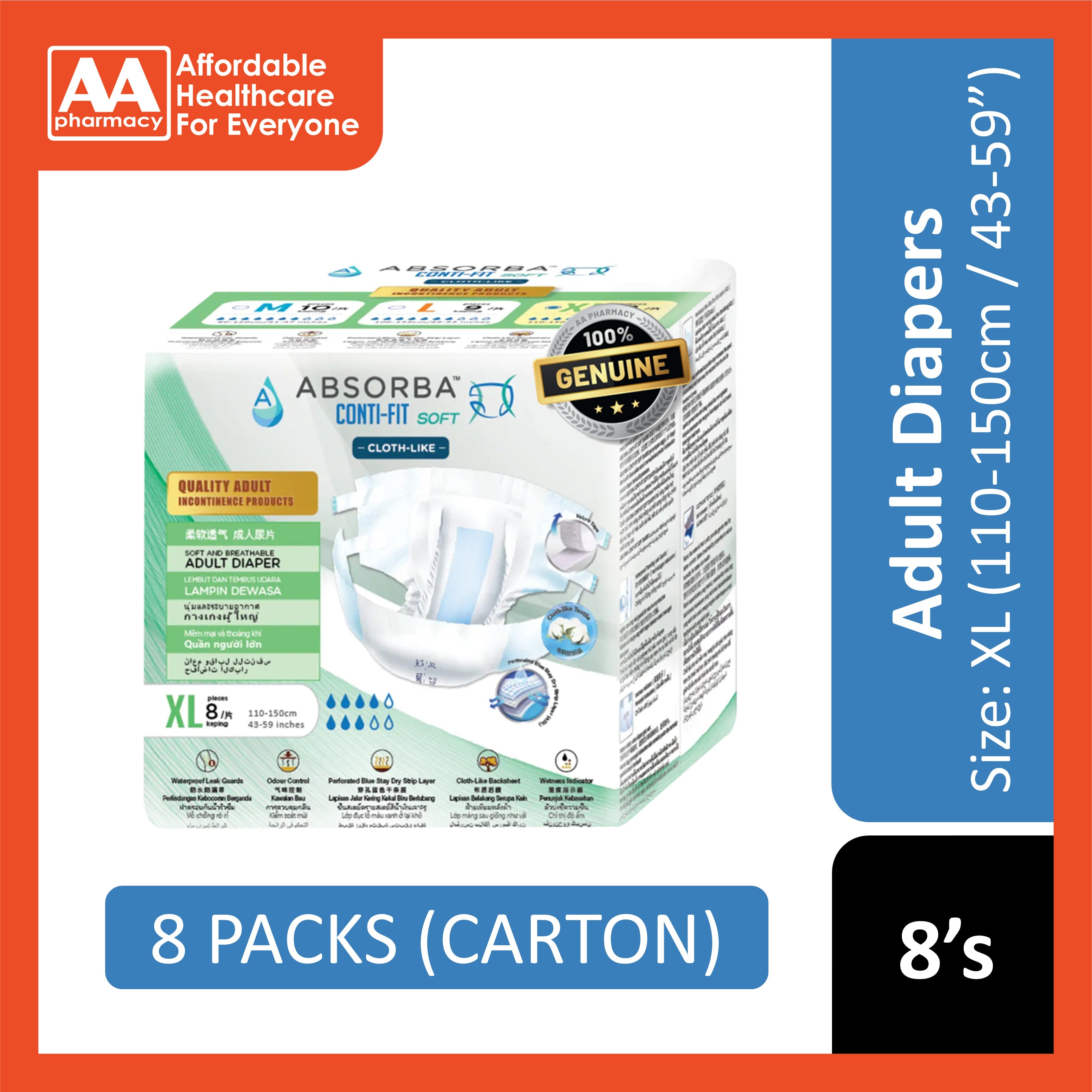 Absorba Conti-Fit Soft Adult Diapers Size XL 8's (110-150cm / 43-59 inches) [8 Packs/Carton]
