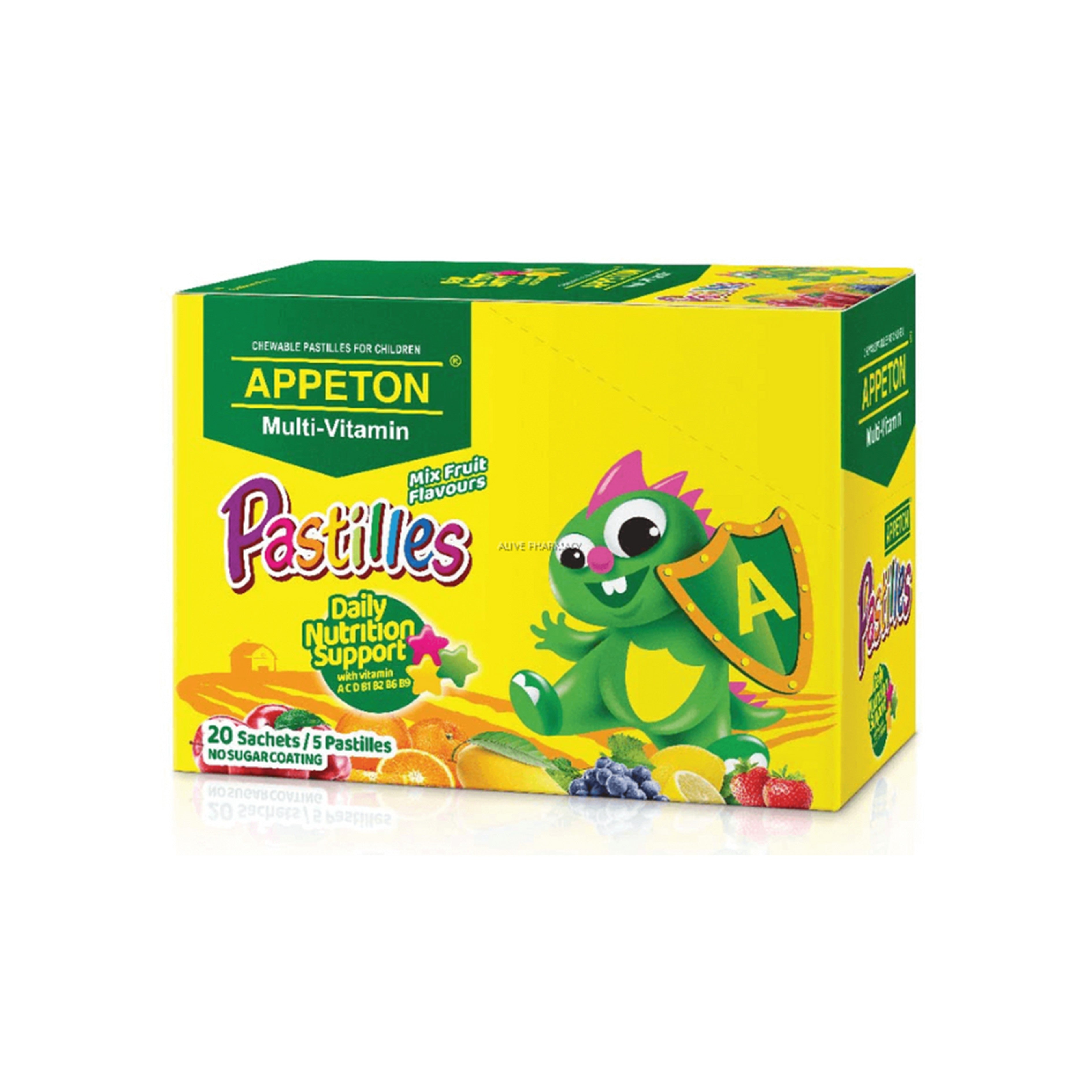 Appeton Multi-vitamin Pastille are healthy chewable pastilles (non sugar-coated) for children. It is fortified with 7 important vitamins in one pastille that fulfill your child’s daily needs to stay healthy every day! It is star shaped and is available in 4 tasty fruity flavors (mixed flavors in each sachet).