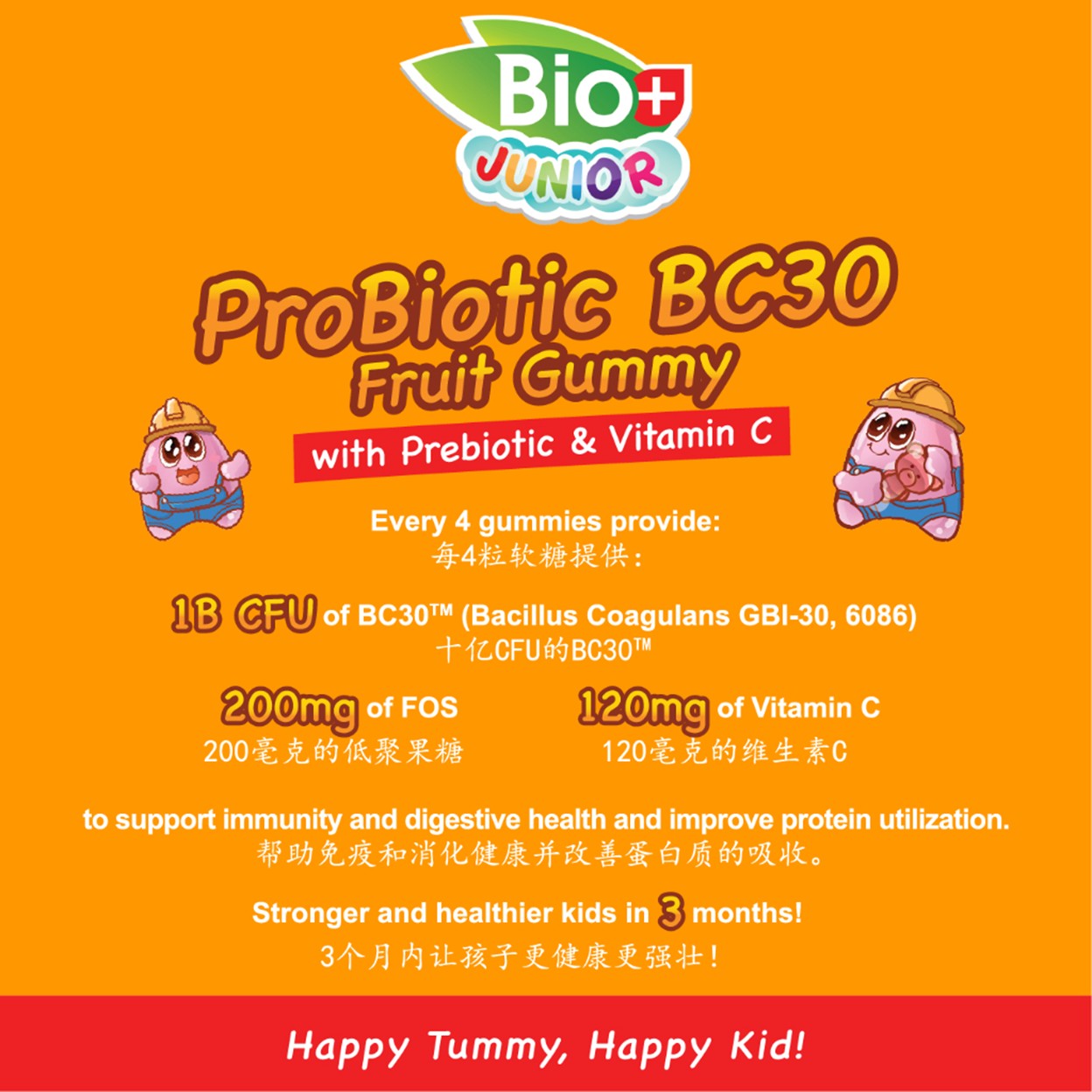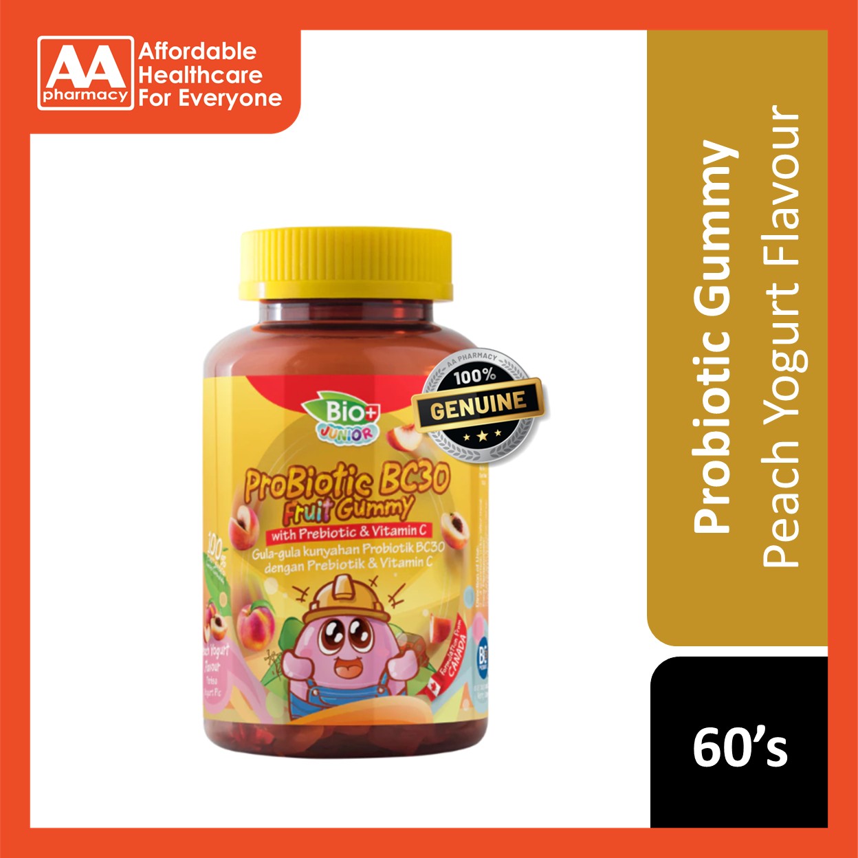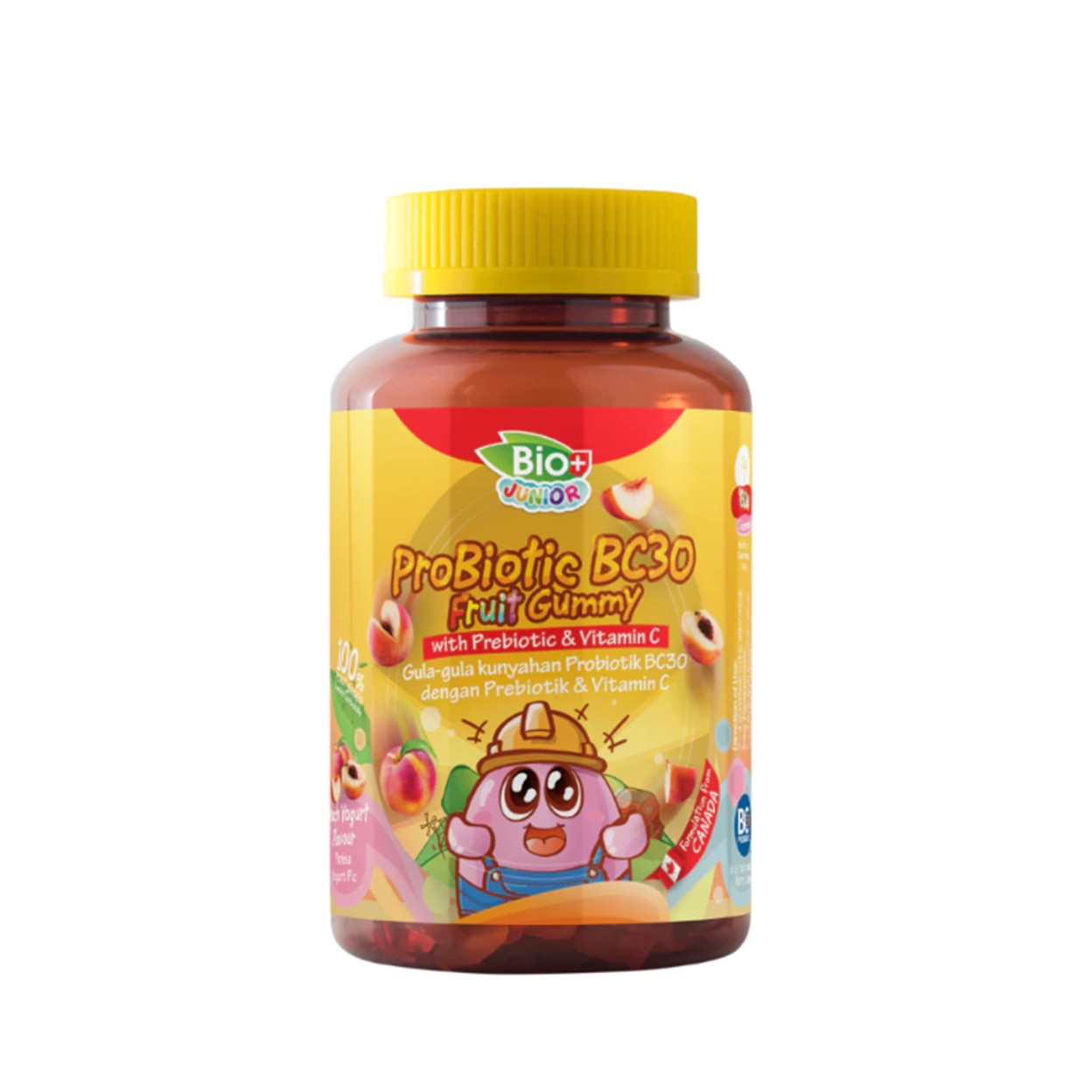 BioPlus Junior ProBiotic BC30 Fruit Gummy is specially formulated to support your child's digestive and immune health. Each serving of 4 delicious peach yogurt-flavored gummies contains 1 billion CFU of patented BC30 probiotics, a clinically proven probiotic strain with powerful results in just 3 months!