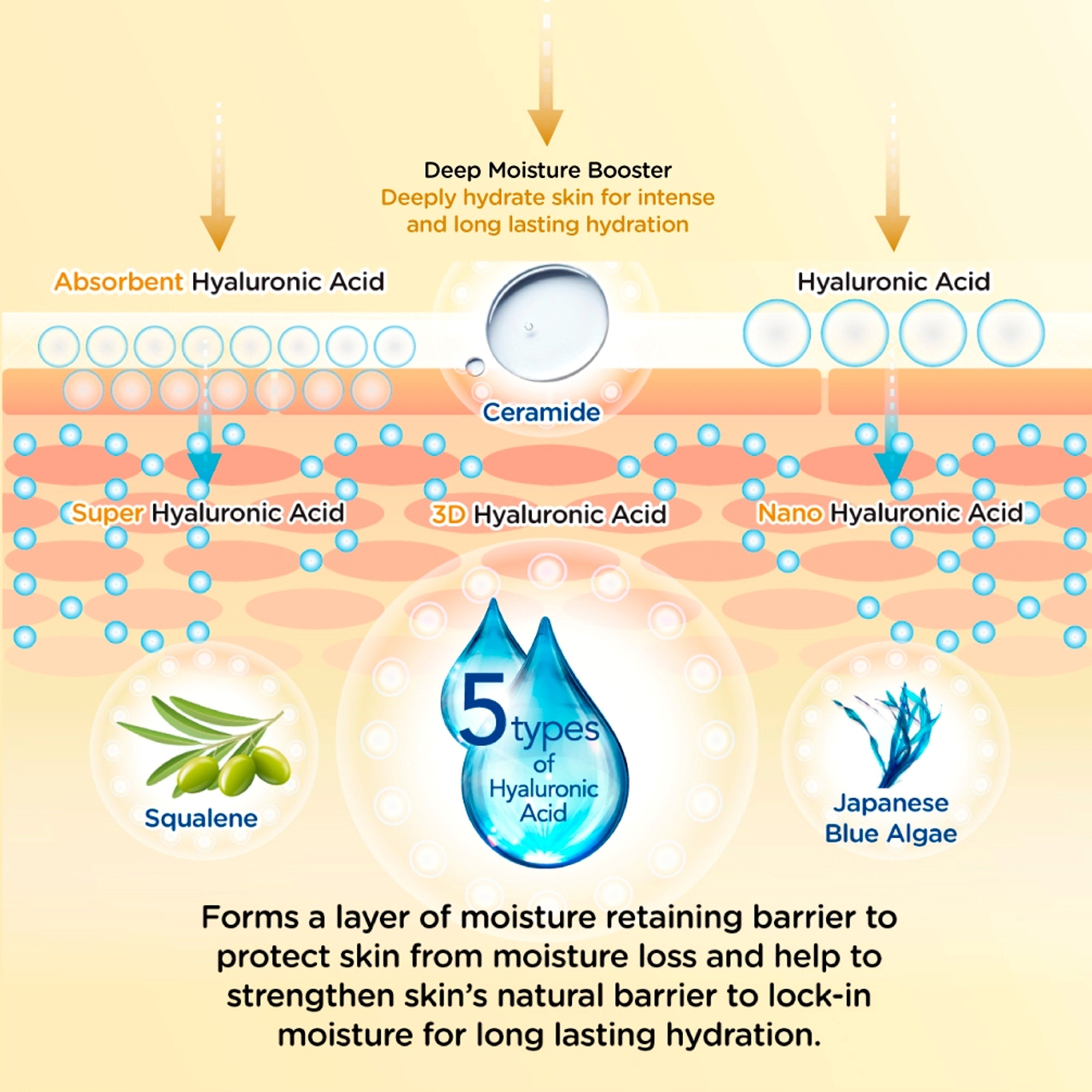Water, Glycerin, Butylene Glycol, Propylene Glycol, Squalene, Limnanthes Alba (Meadowfoam) Seed Oil, Phenoxyethanol, Chlorphenesin, Sodium Hyaluronate, Ammonium Acryloyldimethyltaurate/ VP Copolymer, Dipotassium Glycyrrhizate, Polysorbate 20, Sodium Polyglutamate, Sodium PCA, Iodopropynyl Butylcarbamate, Hydrolyzed Hyaluronic Acid, Hydroxypropyltrimonium Hyaluronate, Sodium Acetylated Hyaluronate, Sodium Hyaluronate Crosspolymer, Sodium Lauroyl Lactylate, Pentylene Glycol, Sodium Polyacrylate Starch, Ceramide 3, Ceramide 6 II, Phytosphingosine, Aphanothece Sacrum Polysaccharides, Cholesterol, Ethylhexylglycerin, Xanthan Gum, Carbomer, Ceramide 1.
