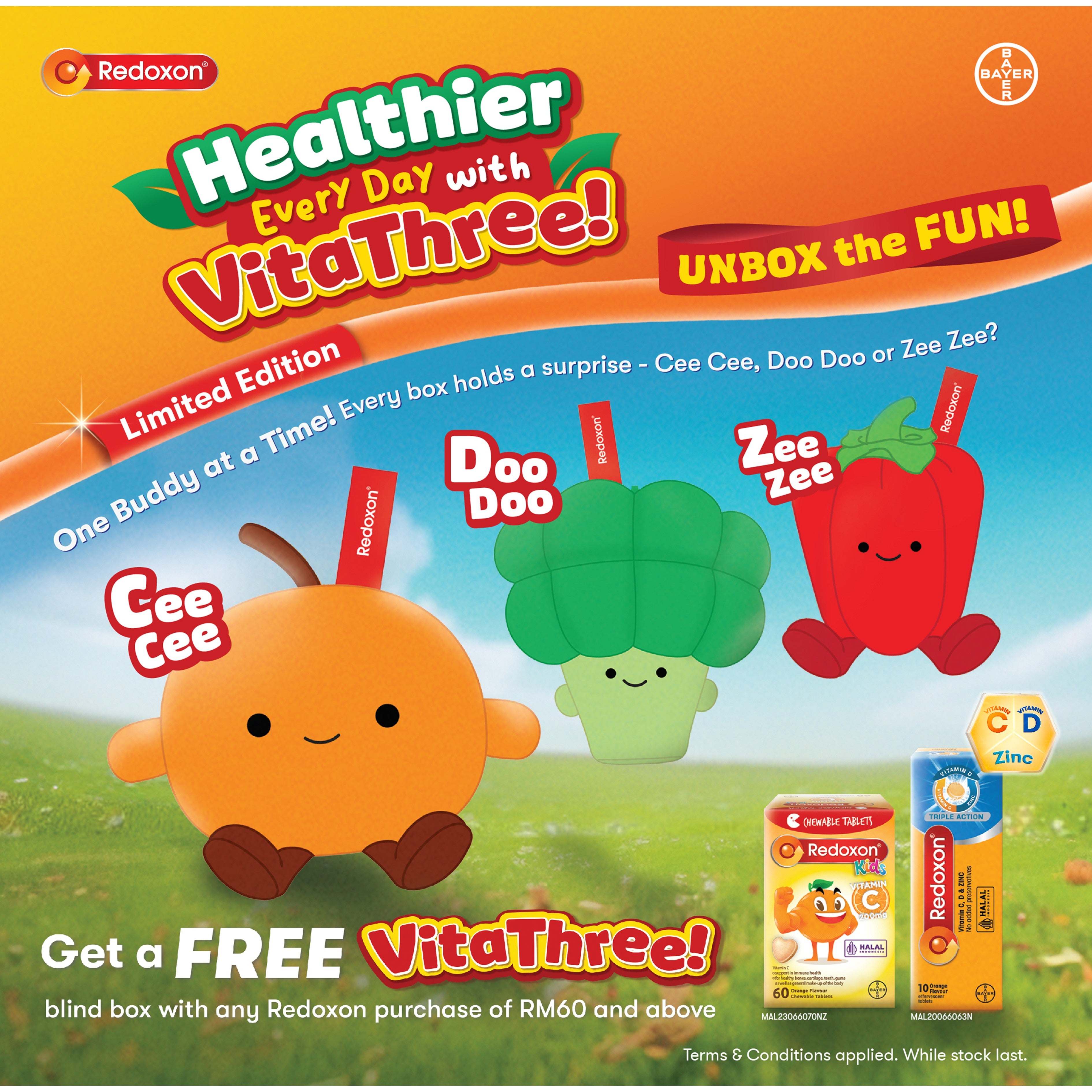 Free Redoxon VitaThree Blind Box 1's with any purchase of Redoxon products worth RM60 and above on AA Pharmacy online stores.