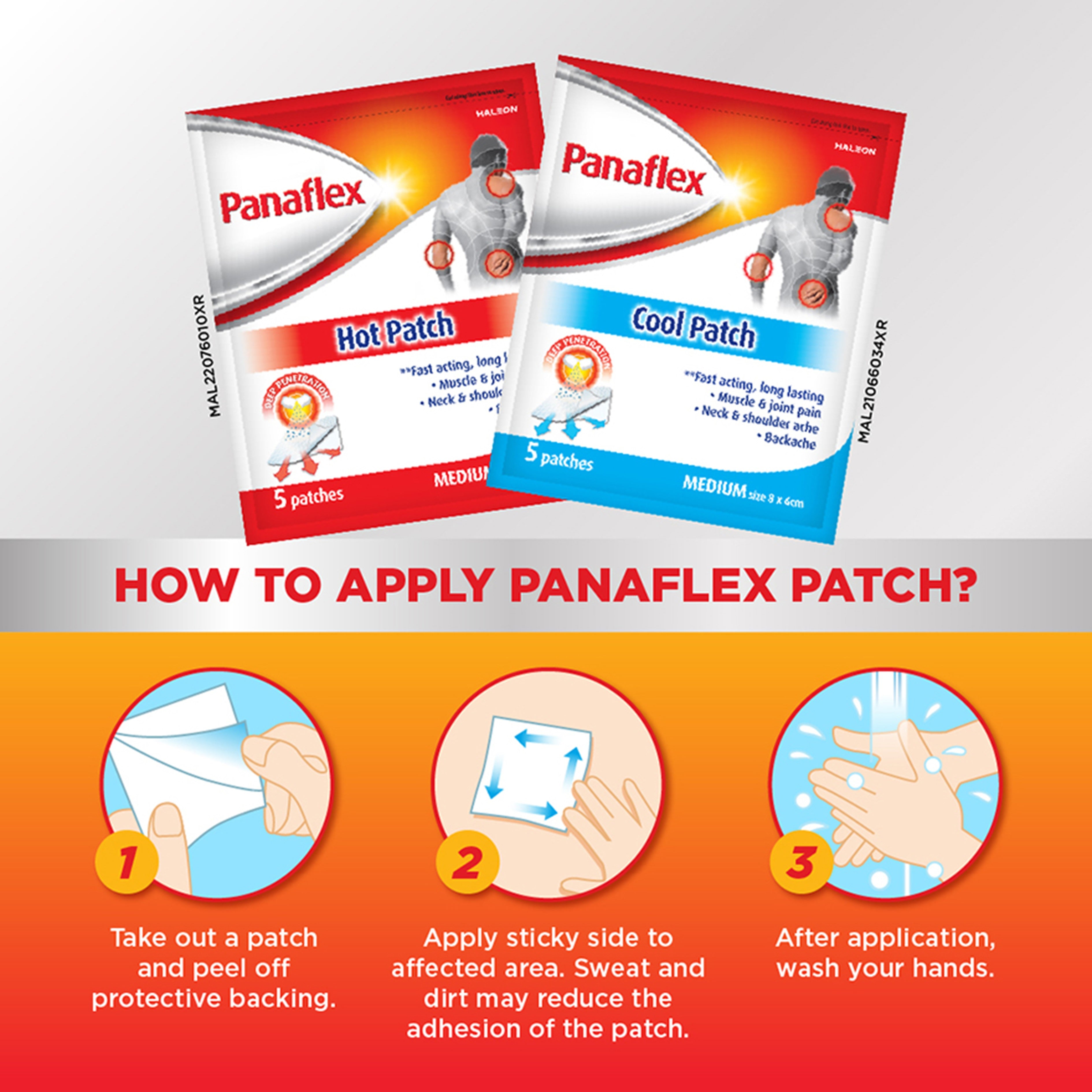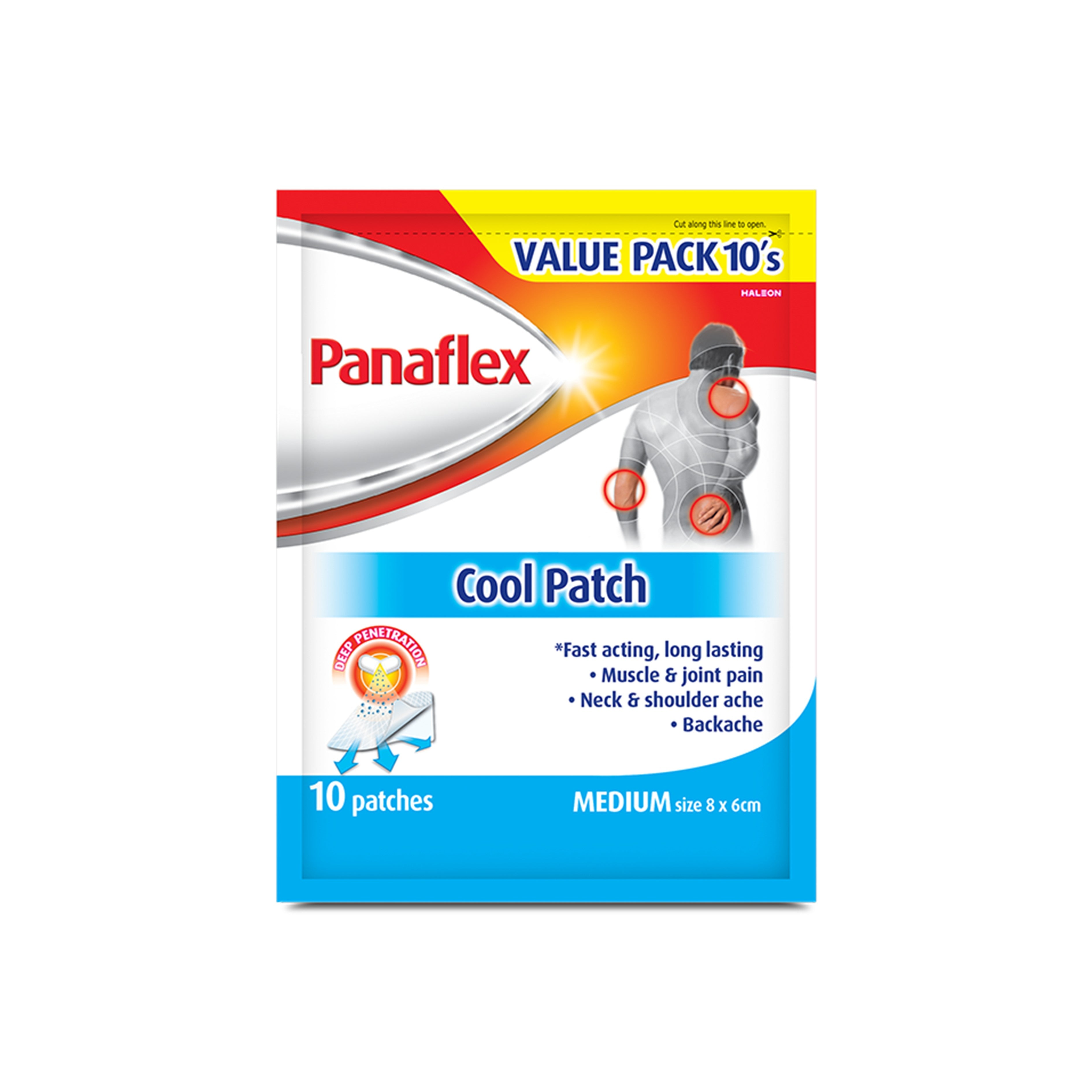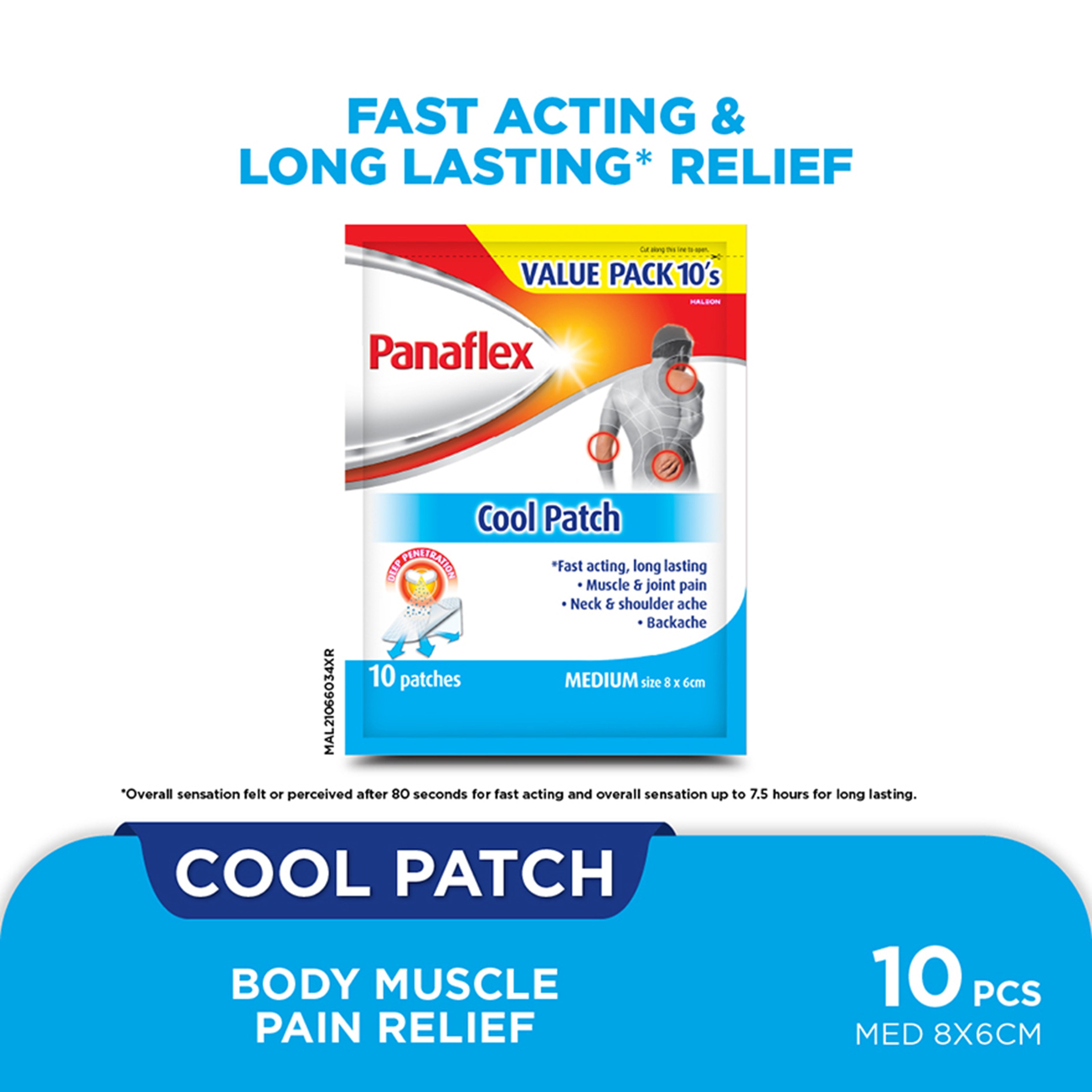 Panaflex Cool Patch provides fast acting and long-lasting* sensation. The patch provides temporary relief of muscular and joint pain e.g. due to simple backache, strains, sprains.