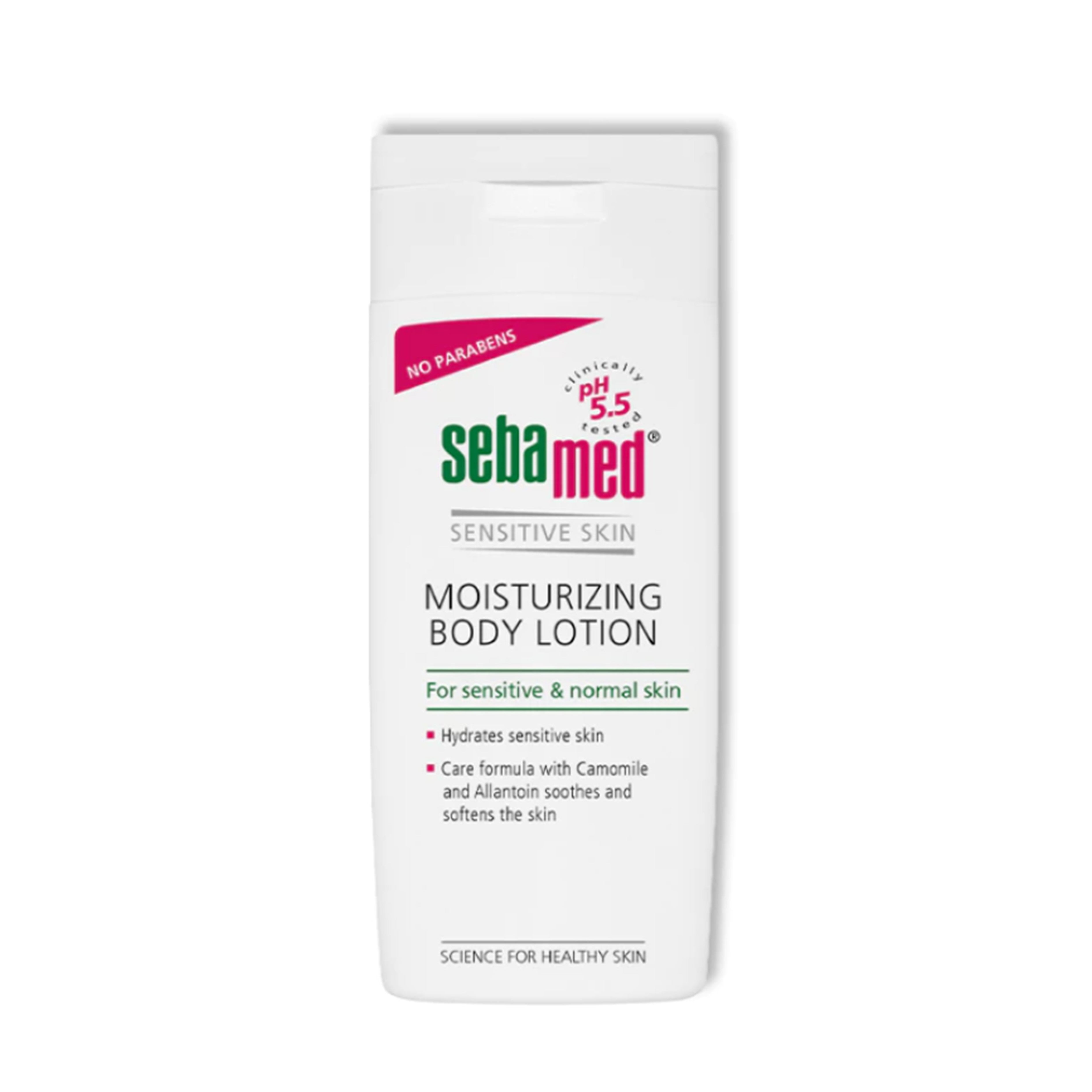 Sebamed Moisturizing Body Lotion contains care formula with Chamomile and Allantoin to hydrate sensitive skin. It nourishes and preserves the natural moisture balance of the skin. It is naturally cooling and calming, readily absorbed without residue and tones the skin, refreshing its appearance. With the same pH 5.5 value as healthy skin, it supports and protects the skin’s natural protective acid mantle.