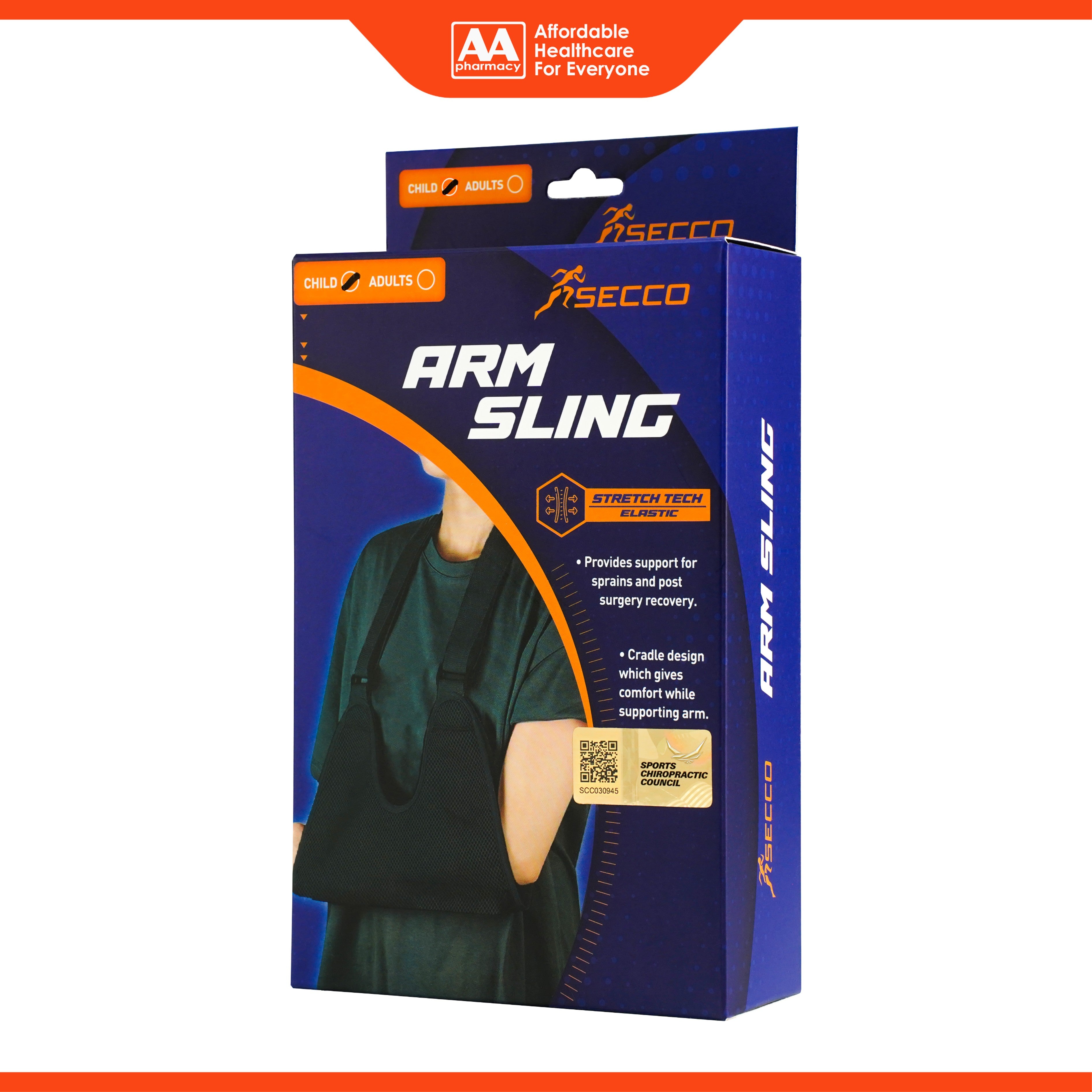 Secco Arm Sling has been designed to hold, support and immobilise the affected arm or shoulder after an injury or surgery. The sling is worn around the neck to help reduce pain and to support the injured arm in a secure and comfortable position. The children arm sling is suitable for individuals aged 6 to 12 whereas adult arm sling is suitable for individuals aged 12 and above. However, size may vary depending to hand length.