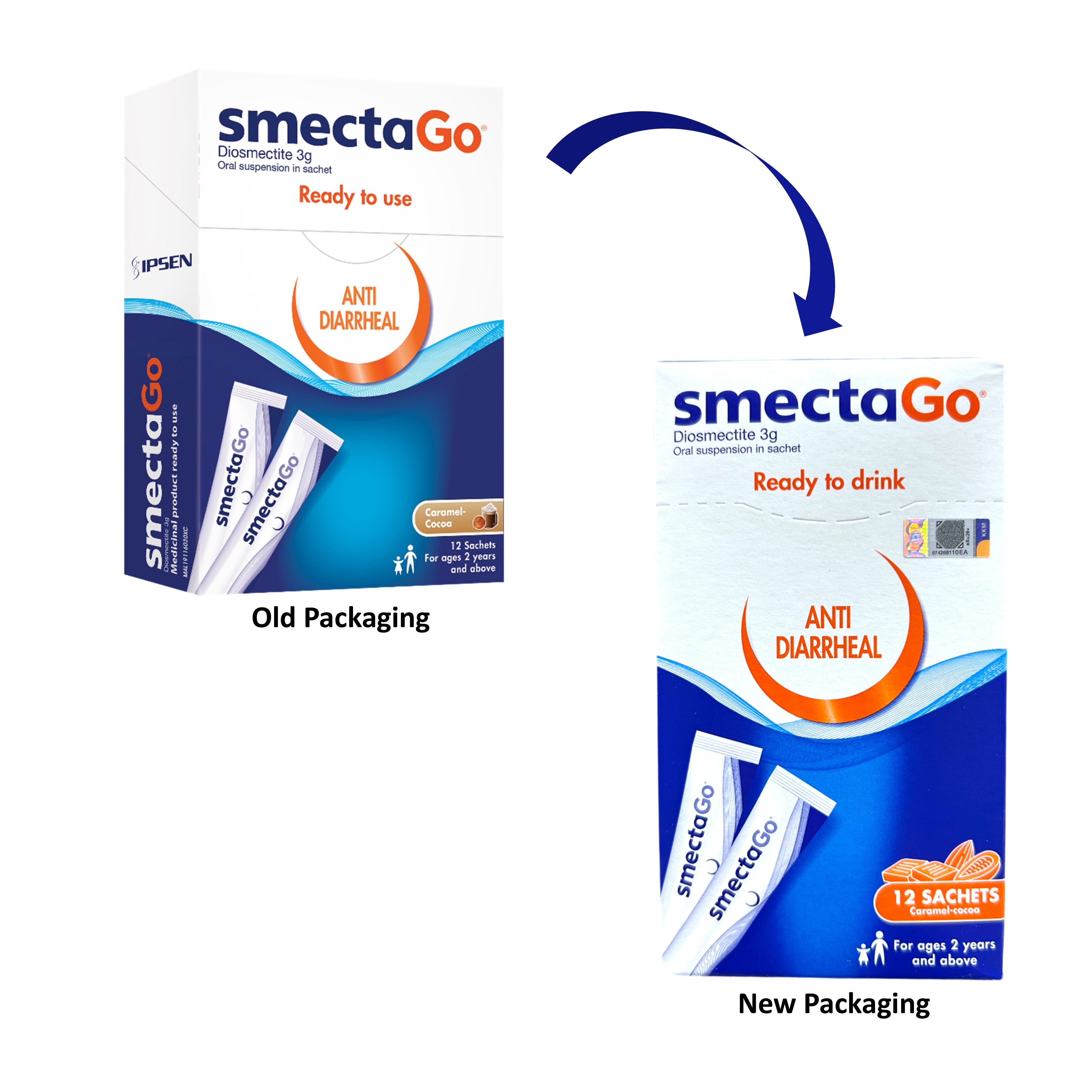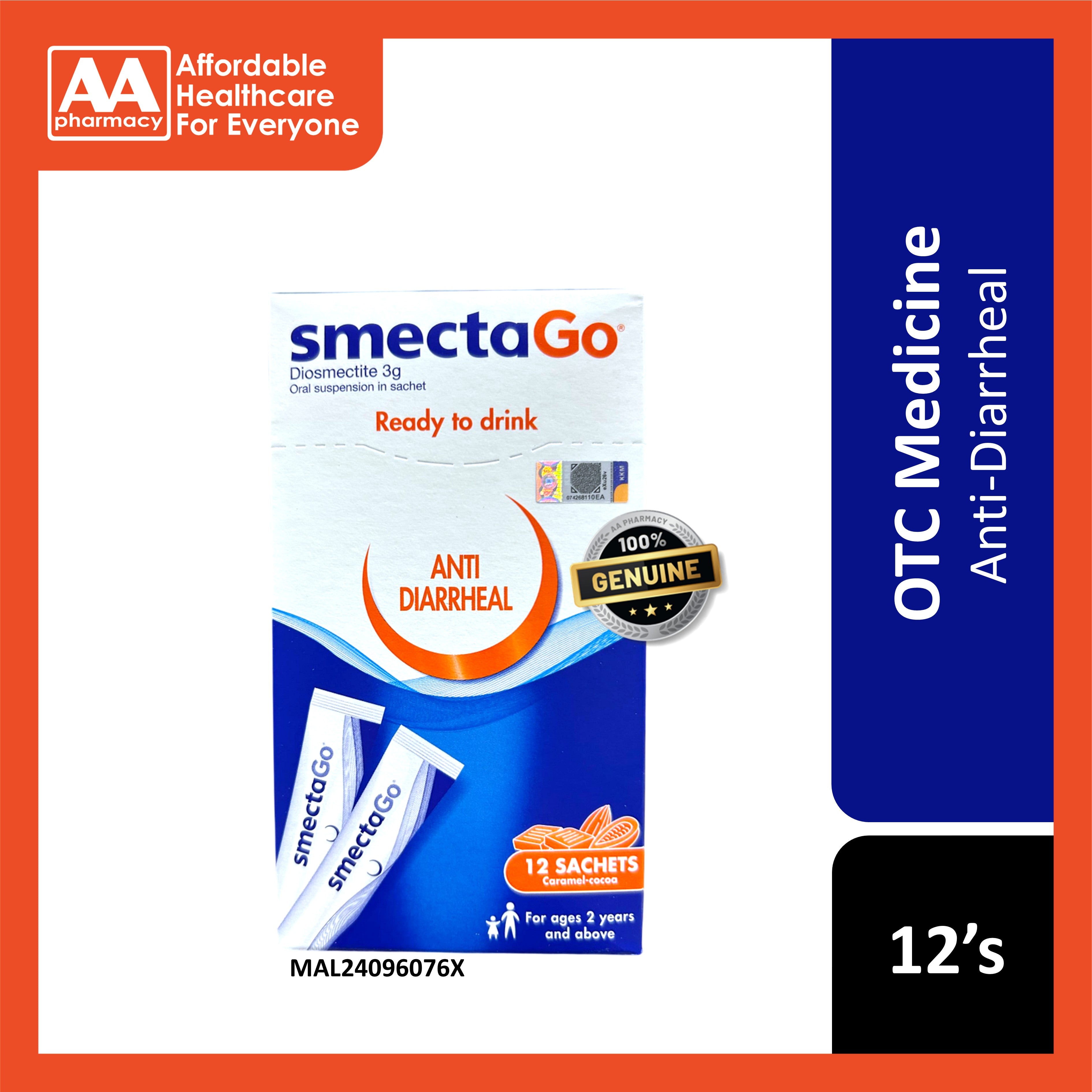 Smecta Go is a beige to light beige homogeneous suspension with a characteristic odour of caramel. The product is a ready-to-drink oral suspension. Each box contains 12 sachets.
