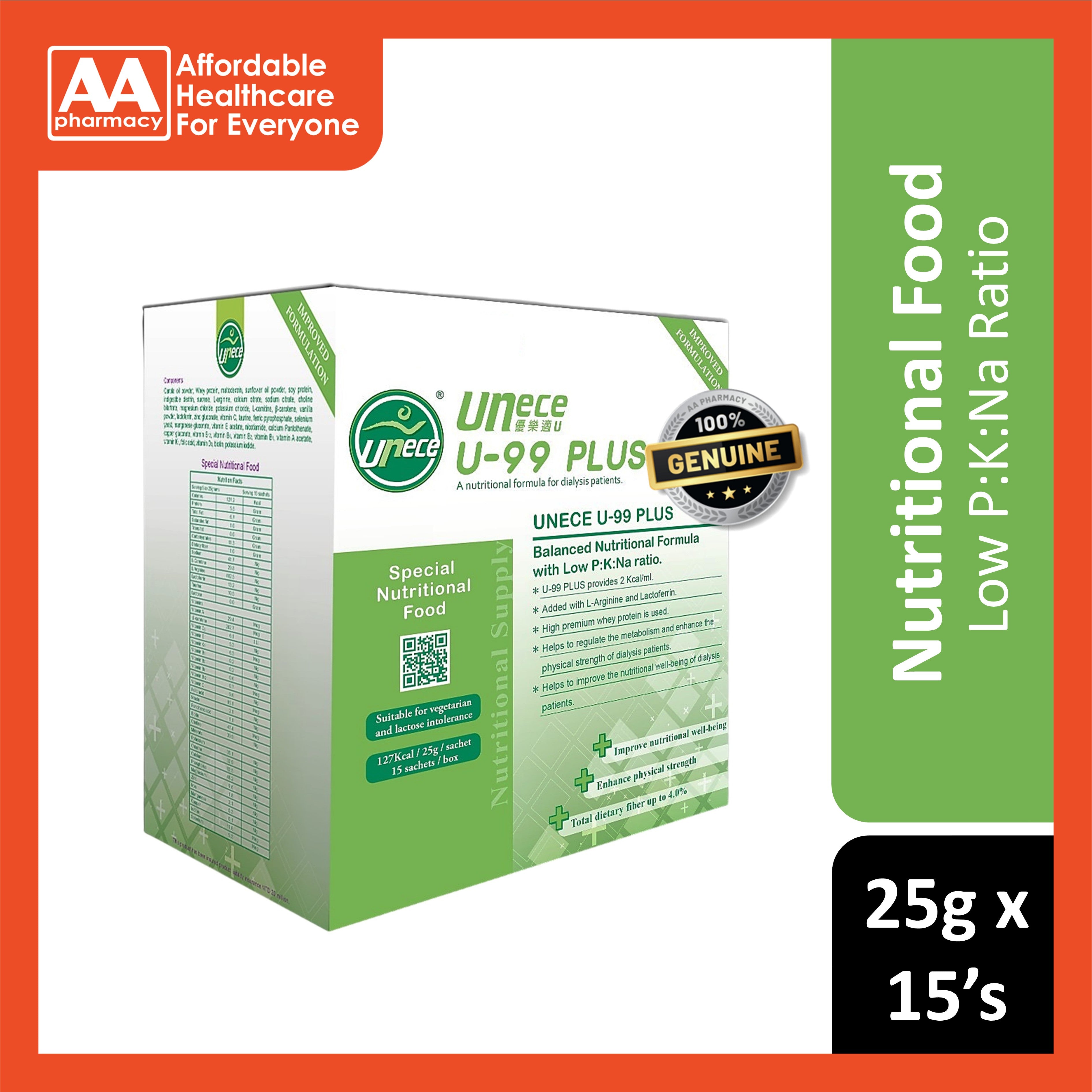 Unece U-99 Plus Balanced Nutritional Formula with Low P:K:Na Ratio Sachet 25gx15's (For Dialysis Patients)