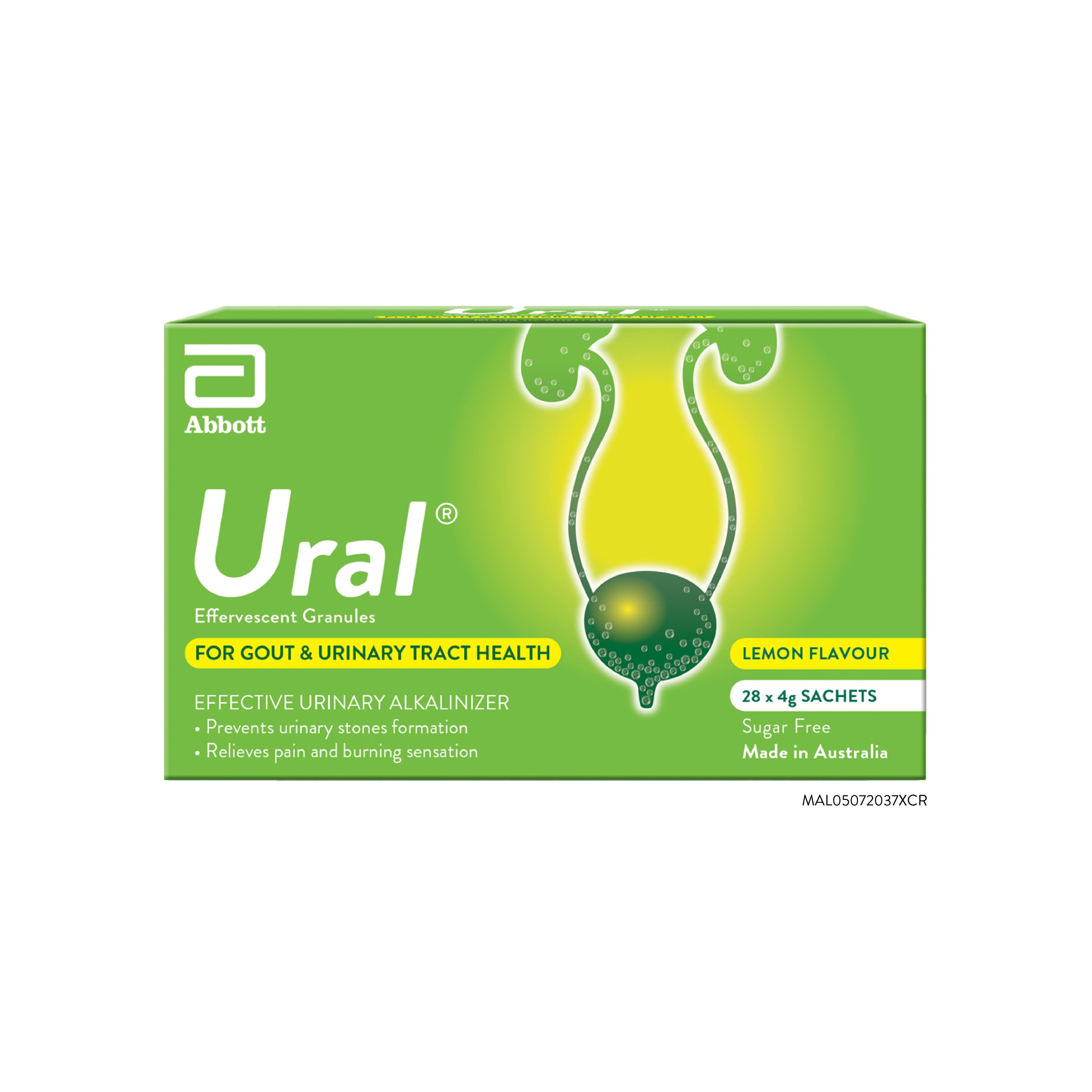 Ural® is an effective SUGAR FREE, LEMON FLAVOURED urinary alkalinizer that is MADE IN AUSTRALIA. Ural® helps prevent the formation of uric acid crystals in gout therapy and maintains alkaline urine, which may aid in the dissolution of uric acid stones.